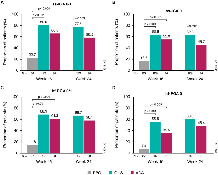 Results: A total of 76, 153, and 106 psoriasis patients with self-reported PsA were randomized to the placebo, guselkumab, or adalimumab groups, respectively; the baseline characteristics of patients in all three arms were comparable. At W16, a greater proportion of guselkumab- versus placebo-treated patients achieved ss-IGA 0/1 (80.6% vs. 22.7%, p < 0.001), hf-PGA 0/1 (68.9% vs. 14.8%, p < 0.001), f-PGA 0/1 (47.6% vs. 17.0%, p < 0.001), and DLQI 0/1 (45.6% vs. 2.7%, p < 0.001) responses; mean percentage NAPSI improvement was also greater with guselkumab (39.5% vs. 6.5%, p < 0.001). At W24, patients receiving guselkumab had higher ss-IGA 0/1 (77.5% vs. 58.5%, p = 0.003) and DLQI 0/1 (47.7% vs. 34.3%, p = 0.024) response rates versus those receiving adalimumab. Response rates/mean percentage improvements at W48 (VOYAGE-1) were numerically greater with guselkumab than adalimumab (e.g., NAPSI improvement: 75.6% vs. 60.9%).