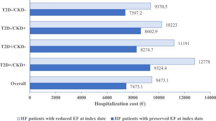 Results: In 2019, a total of 430,544 patients were hospitalized in France with HF as a primary or associated diagnosis, with 51.9% male and 48.1% female and a mean age of 79.0 years. More than 75% of the study population was composed of prevalent HF patients. About 3.1% of patients were diagnosed with at least one event of cardiac decompensation during follow-up. Also, 20.2% and 9.9% of patients were identified with preserved and reduced EFs, respectively. The average number and length of hospital stays were 1.7 per patient and 10.4 days per patient, respectively. The annual cost of hospitalization for HF was €8341.3 per patient. Presence of cardiac decompensation at index date or during follow-up, reduced EF, and comorbidities were associated with numerically higher frequency and length of hospitalization, and hospitalization cost. For hospitalization and 'liste-en-sus' medical devices, higher cost was observed in incident than prevalent HF patients, while for 'liste-en-sus' drugs, higher cost was reported in prevalent than incident HF patients.