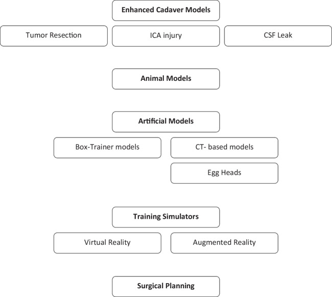 Endoscopic transsphenoidal surgery is a novel surgical technique requiring specific training. Different models and simulators have been recently suggested for it, but no systematic review is available. To provide a systematic and critical literature review and up-to-date description of the training models or simulators dedicated to endoscopic transsphenoidal surgery. A search was performed on PubMed and Scopus databases for articles published until February 2023; Google was also searched to document commercially available. For each model, the following features were recorded: training performed, tumor/arachnoid reproduction, assessment and validation, and cost. Of the 1199 retrieved articles, 101 were included in the final analysis. The described models can be subdivided into 5 major categories: (1) enhanced cadaveric heads; (2) animal models; (3) training artificial solutions, with increasing complexity (from "box-trainers" to multi-material, ct-based models); (4) training simulators, based on virtual or augmented reality; (5) Pre-operative planning models and simulators. Each available training model has specific advantages and limitations. Costs are high for cadaver-based solutions and vary significantly for the other solutions. Cheaper solutions seem useful only for the first stages of training. Most models do not provide a simulation of the sellar tumor, and a realistic simulation of the suprasellar arachnoid. Most artificial models do not provide a realistic and cost-efficient simulation of the most delicate and relatively common phase of surgery, i.e., tumor removal with arachnoid preservation; current research should optimize this to train future neurosurgical generations efficiently and safely.