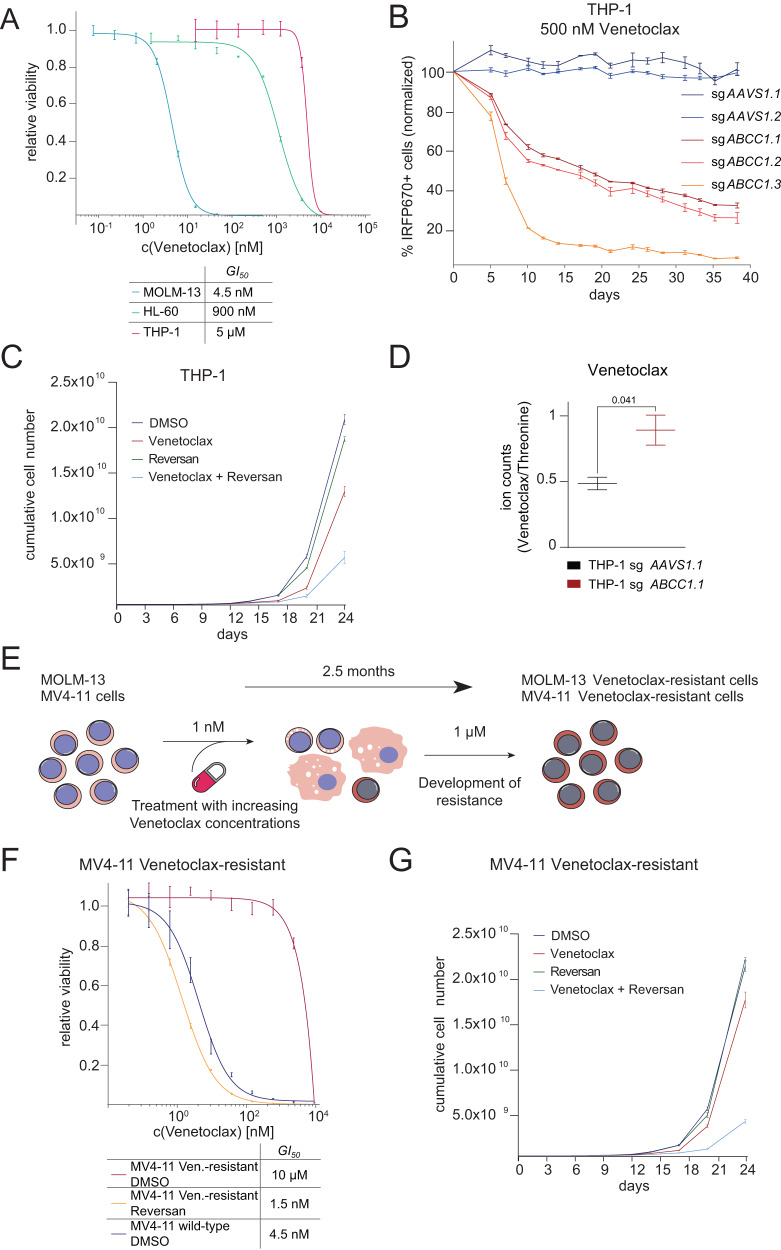 The BCL-2 inhibitor Venetoclax is a promising agent for the treatment of acute myeloid leukemia (AML). However, many patients are refractory to Venetoclax, and resistance develops quickly. ATP-binding cassette (ABC) transporters mediate chemotherapy resistance but their role in modulating the activity of targeted small-molecule inhibitors is unclear. Using CRISPR/Cas9 screening, we find that loss of ABCC1 strongly increases the sensitivity of AML cells to Venetoclax. Genetic and pharmacologic ABCC1 inactivation potentiates the anti-leukemic effects of BCL-2 inhibitors and efficiently re-sensitizes Venetoclax-resistant leukemia cells. Conversely, ABCC1 overexpression induces resistance to BCL-2 inhibitors by reducing intracellular drug levels, and high ABCC1 levels predicts poor response to Venetoclax therapy in patients. Consistent with ABCC1-specific export of glutathionylated substrates, inhibition of glutathione metabolism increases the potency of BCL-2 inhibitors. These results identify ABCC1 and glutathione metabolism as mechanisms limiting efficacy of BCL-2 inhibitors, which may pave the way to development of more effective therapies.