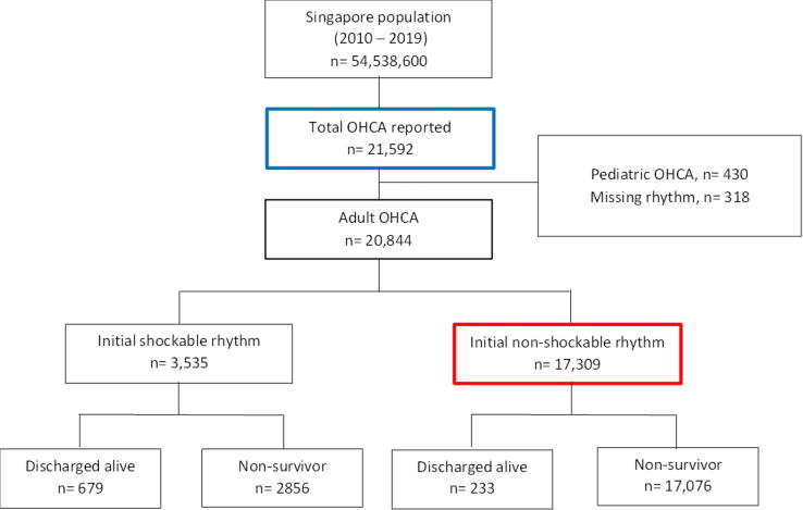 Aim: Out-of-hospital cardiac arrest (OHCA) with an initial non-shockable rhythm is the predominant form of OHCA in adults. We evaluated its 10-year trends in epidemiology and management in Singapore.