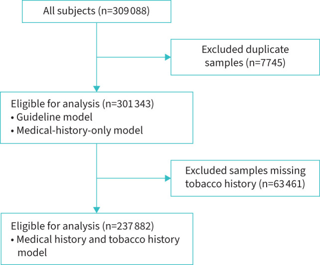 Results: Out of 301 343 subjects, 1529 (0.5%) had PI*ZZ genotype. Predictors of severe AATD were asthma, bronchitis, emphysema, allergies, bronchiectasis, family history of AATD, cirrhosis, hepatitis and history of abnormal liver function tests. The derived model establishes a subject's risk of severe AATD, and scores ≥0 had an estimated risk of 0.41%, sensitivity 84.62% and specificity 24.32%. A model simulating guideline recommendations had an estimated risk of 0.51% with a sensitivity of 37.98% and specificity 46.60%. By recommending screening for scores ≥0, we estimate that more subjects would be screened (75.7% versus 53.4%) and detected (84.6% versus 58.2%) compared to a guideline-simulated model.