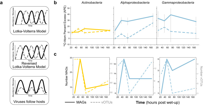 Viruses are abundant, ubiquitous members of soil communities that kill microbial cells, but how they respond to perturbation of soil ecosystems is essentially unknown. Here, we investigate lineage-specific virus-host dynamics in grassland soil following "wet-up", when resident microbes are both resuscitated and lysed after a prolonged dry period. Quantitative isotope tracing, time-resolved metagenomics and viromic analyses indicate that dry soil holds a diverse but low biomass reservoir of virions, of which only a subset thrives following wet-up. Viral richness decreases by 50% within 24 h post wet-up, while viral biomass increases four-fold within one week. Though recent hypotheses suggest lysogeny predominates in soil, our evidence indicates that viruses in lytic cycles dominate the response to wet-up. We estimate that viruses drive a measurable and continuous rate of cell lysis, with up to 46% of microbial death driven by viral lysis one week following wet-up. Thus, viruses contribute to turnover of soil microbial biomass and the widely reported CO2 efflux following wet-up of seasonally dry soils.