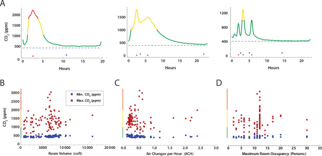 Results: 97% of rooms had an estimated ACH ≤4.0, with 7% having CO2 levels ≥2,000 ppm for up to 3 hours per school day. A statistically significant correlation was found between the time that a room had CO2 levels ≥1,000 ppm and SARS-CoV-2 PCR tests normalized to room occupancy, accounting for 43% of the variance. No statistically significant correlation was found for room ACH and per-room SARS-CoV-2 cases. Rooms with ventilation systems using MERV-13 filters had lower SARS-CoV-2-positive PCR counts. These findings led to ongoing efforts to upgrade the ventilation systems in this community-engaged research project.