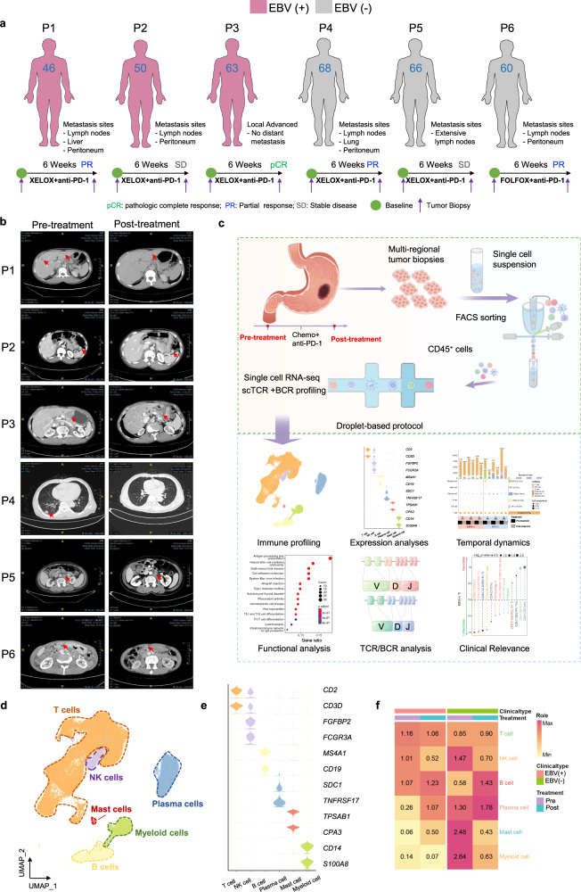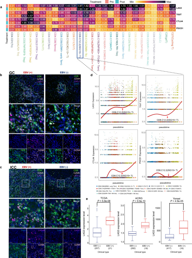 Epstein‒Barr virus (EBV)-associated gastric cancer (GC) manifests an intriguing immunotherapy response. However, the cellular basis for EBV-imprinted tumour immunity and on-treatment response remains undefined. This study aimed to finely characterize the dynamic tumour immune contexture of human EBV (+) GC treated with immunochemotherapy by longitudinal scRNA-seq and paired scTCR/BCR-seq. EBV (+) GC exhibits an inflamed-immune phenotype with increased T-cell and B-cell infiltration. Immunochemotherapy triggers clonal revival and reinvigoration of effector T cells which step to determine treatment response. Typically, an antigen-specific ISG-15+CD8+ T-cell population is highly enriched in EBV (+) GC patients, which represents a transitory exhaustion state. Importantly, baseline intratumoural ISG-15+CD8+ T cells predict immunotherapy responsiveness among GC patients. Re-emerged clonotypes of pre-existing ISG-15+CD8+ T cells could be found after treatment, which gives rise to a CXCL13-expressing effector population in responsive EBV (+) tumours. However, LAG-3 retention may render the ISG-15+CD8+ T cells into a terminal exhaustion state in non-responsive EBV (+) tumours. In accordance, anti-LAG-3 therapy could effectively reduce tumour burden in refractory EBV (+) GC patients. Our results delineate a distinct implication of EBV-imprinted on-treatment T-cell immunity in GC, which could be leveraged to optimize the rational design of precision immunotherapy.