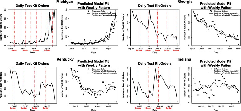 Results: In total, 164,402 DTC test kits were ordered during the intervention. Distribution of tests at all sites were significantly geospatially clustered at the block-group level (Moran's I: p < 0.001); however, education, income, age, population density, race, and social vulnerability index were inconsistently associated with test orders across sites. In Michigan, Georgia, and Kentucky, there were strong associations between same-day COVID-19 incidence and test kit orders (Michigan: r = 0.89, Georgia: r = 0.85, Kentucky: r = 0.75). The incidence of COVID-19 during the current day and the previous 6-days increased current DTC orders by 9.0 (95% CI = 1.7, 16.3), 3.0 (95% CI = 1.3, 4.6), and 6.8 (95% CI = 3.4, 10.2) in Michigan, Georgia, and Kentucky, respectively. There was no same-day or 6-day lagged correlation between test kit orders and COVID-19 incidence in Indiana.