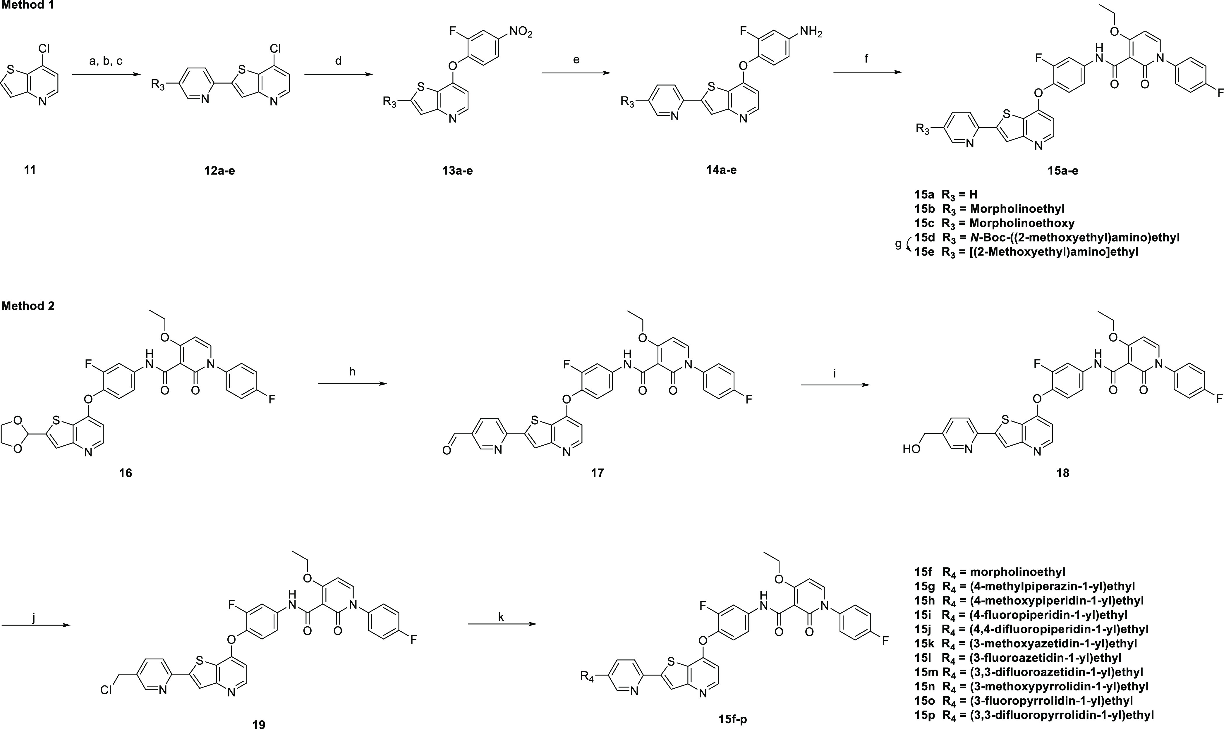 Herein, we report the identification, structural optimization, and biological efficacy of thieno[2,3-b]pyridines as potent inhibitors of splice variants of the tyrosine kinase recepteur d'origine nantais (RON). Among synthesized compounds, compound 15f exhibited excellent in vitro kinase inhibition and antiproliferative activity, as well as in vivo antineoplastic efficacy against RON splice variant-expressing tumors. Moreover, compound 15f with excellent pharmacokinetics demonstrated significant activity with greater tumor growth inhibition (74.9% at 10 mg/kg) than compounds 2 and 4 in a patient-derived xenograft model. Collectively, 15f represents a promising, novel anticancer agent targeting RON splice variants.