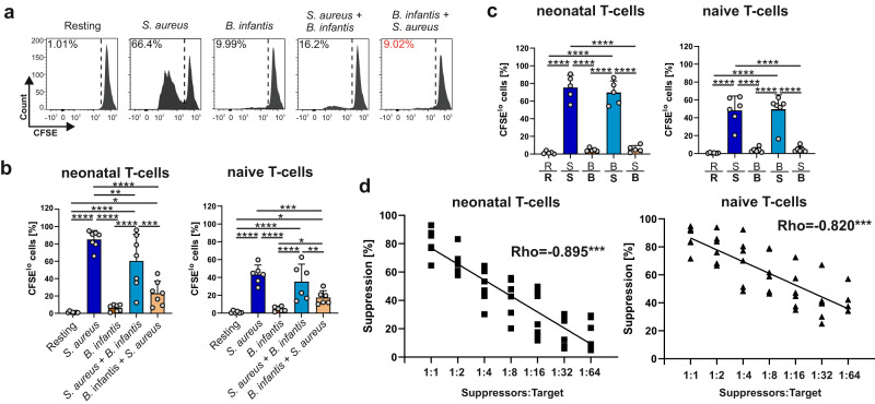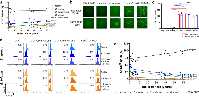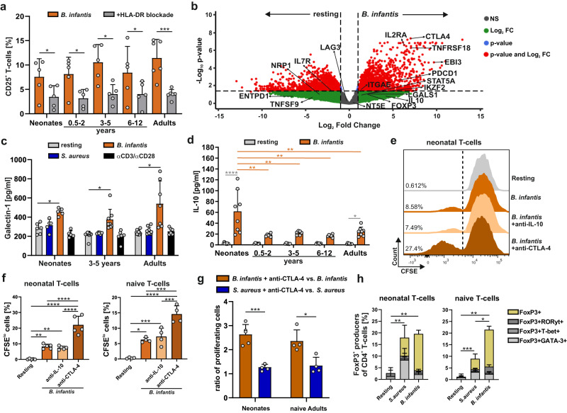 Microbial infections early in life are challenging for the unexperienced immune system. The SARS-CoV-2 pandemic again has highlighted that neonatal, infant, child, and adult T-helper(Th)-cells respond differently to infections, and requires further understanding. This study investigates anti-bacterial T-cell responses against Staphylococcus aureus aureus, Staphylococcus epidermidis and Bifidobacterium longum infantis in early stages of life and adults and shows age and pathogen-dependent mechanisms. Beside activation-induced clustering, T-cells stimulated with Staphylococci become Th1-type cells; however, this differentiation is mitigated in Bifidobacterium-stimulated T-cells. Strikingly, prestimulation of T-cells with Bifidobacterium suppresses the activation of Staphylococcus-specific T-helper cells in a cell-cell dependent manner by inducing FoxP3+CD4+ T-cells, increasing IL-10 and galectin-1 secretion and showing a CTLA-4-dependent inhibitory capacity. Furthermore Bifidobacterium dampens Th responses of severely ill COVID-19 patients likely contributing to resolution of harmful overreactions of the immune system. Targeted, age-specific interventions may enhance infection defence, and specific immune features may have potential cross-age utilization.