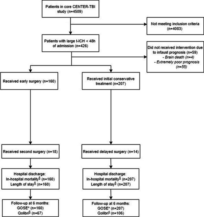 Methods: In a prospective cohort, we included patients with a large t-ICH (< 48 h of injury). Primary outcome was the Glasgow Outcome Scale Extended (GOSE) at 6 months, analyzed with multivariable proportional odds logistic regression. Subgroups included injury severity and isolated vs. non-isolated t-ICH.