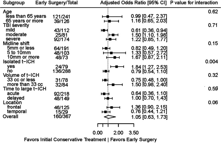 Results: A total of 367 patients with a large t-ICH were included, of whom 160 received early surgery and 207 received conservative treatment. Patients receiving early surgery were younger (median age 54 vs. 58 years) and more severely injured (median Glasgow Coma Scale 7 vs. 10) compared to those treated conservatively. In the overall cohort, early surgery was not associated with better functional outcome (adjusted odds ratio (AOR) 1.1, (95% CI, 0.6-1.7)) compared to conservative treatment. Early surgery was associated with better outcome for patients with moderate TBI and isolated t-ICH (AOR 1.5 (95% CI, 1.1-2.0); P value for interaction 0.71, and AOR 1.8 (95% CI, 1.3-2.5); P value for interaction 0.004). Conversely, in mild TBI and those with a smaller t-ICH (< 33 cc), conservative treatment was associated with better outcome (AOR 0.6 (95% CI, 0.4-0.9); P value for interaction 0.71, and AOR 0.8 (95% CI, 0.5-1.0); P value for interaction 0.32).