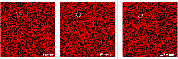 Results: The results demonstrated significant changes in CC flow deficits from baseline to follow-up visits. Specifically, there was a significant decrease in FD% from 28.9 ± 2.2% at baseline to 26.4 ± 1.9% at 6 months (p = 0.023), and further to 24.9 ± 1.7% at 12 months (p = 0.001). Additionally, the FD area gradually contracted over the follow-up period (p < 0.05). Conversely, there was a significant increase in the number of flow deficits compared to baseline (p < 0.05). No statistically significant changes were observed in best-corrected visual acuity (BCVA) at the follow-up visits (p > 0.05).