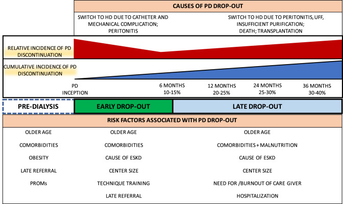 As the global burden of chronic kidney disease continues to increase, the use of peritoneal dialysis is often advocated as the preferred initial dialysis modality. Observational studies suggest a survival advantage for peritoneal dialysis over hemodialysis for the initial 2-3 years of dialysis. Peritoneal dialysis has been associated with better graft survival after kidney transplantation and has a reduced cost burden compared to hemodialysis. However, several medical and non-medical reasons may limit access to peritoneal dialysis, and less than 20% of patients with end-stage kidney disease are treated with peritoneal dialysis worldwide. In this narrative review, we sought to summarize the recent medical literature on risk factors for peritoneal dialysis discontinuation, distinguishing the early and the late phase after peritoneal dialysis initiation. Although the definition of clinically relevant outcomes varies among studies, we observed that center size, older age, and the presence of many comorbidities are risk factors associated with peritoneal dialysis discontinuation, regardless of the phase after peritoneal dialysis initiation. On the contrary, poor technique training and late referral to nephrology care, as opposed to the need for a caregiver, patient burnout and frequent hospitalizations, are related to early and late peritoneal dialysis drop-out, respectively. The aim of the review is to provide an overview of the most relevant parameters to be considered when advising patients in the selection of the most appropriate dialysis modality and in the clinical management of peritoneal dialysis patients. In addition, we wish to provide the readers with a critical appraisal of current literature and a call for a consensus on the definition of clinically relevant outcomes in peritoneal dialysis to better address patients' needs.