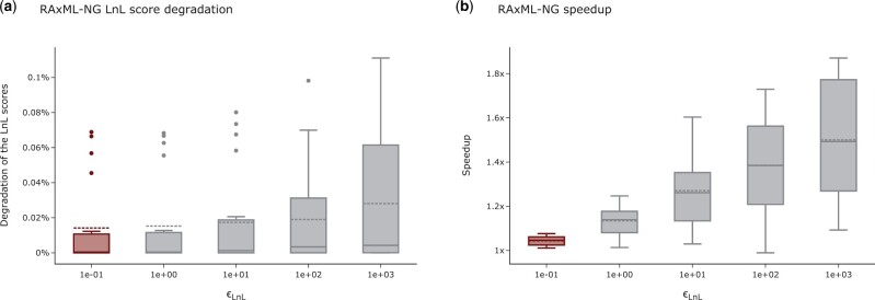 Summary: Maximum likelihood (ML) is a widely used phylogenetic inference method. ML implementations heavily rely on numerical optimization routines that use internal numerical thresholds to determine convergence. We systematically analyze the impact of these threshold settings on the log-likelihood and runtimes for ML tree inferences with RAxML-NG, IQ-TREE, and FastTree on empirical datasets. We provide empirical evidence that we can substantially accelerate tree inferences with RAxML-NG and IQ-TREE by changing the default values of two such numerical thresholds. At the same time, altering these settings does not significantly impact the quality of the inferred trees. We further show that increasing both thresholds accelerates the RAxML-NG bootstrap without influencing the resulting support values. For RAxML-NG, increasing the likelihood thresholds and to 10 and 103, respectively, results in an average tree inference speedup of 1.9 ± 0.6 on Data collection 1, 1.8 ± 1.1 on Data collection 2, and 1.9 ± 0.8 on Data collection 2 for the RAxML-NG bootstrap compared to the runtime under the current default setting. Increasing the likelihood threshold to 10 in IQ-TREE results in an average tree inference speedup of 1.3 ± 0.4 on Data collection 1 and 1.3 ± 0.9 on Data collection 2.