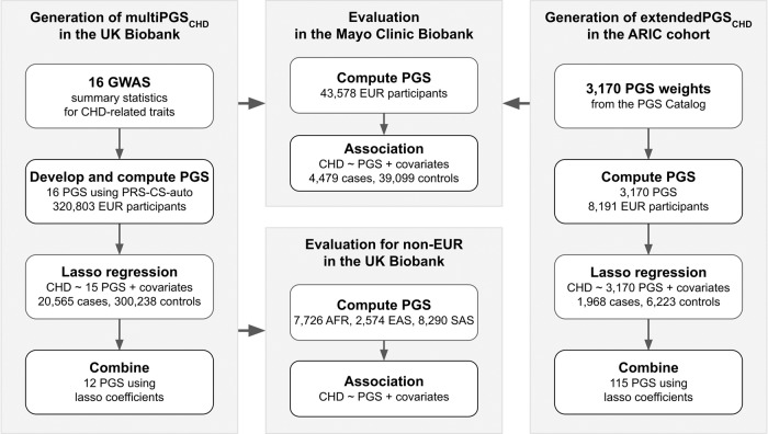 Polygenic scores (PGS) for coronary heart disease (CHD) are constructed using GWAS summary statistics for CHD. However, pleiotropy is pervasive in biology and disease-associated variants often share etiologic pathways with multiple traits. Therefore, incorporating GWAS summary statistics of additional traits could improve the performance of PGS for CHD. Using lasso regression models, we developed two multi-PGS for CHD: 1) multiPGSCHD, utilizing GWAS summary statistics for CHD, its risk factors, and other ASCVD as training data and the UK Biobank for tuning, and 2) extendedPGSCHD, using existing PGS for a broader range of traits in the PGS Catalog as training data and the Atherosclerosis Risk in Communities Study (ARIC) cohort for tuning. We evaluated the performance of multiPGSCHD and extendedPGSCHD in the Mayo Clinic Biobank, an independent cohort of 43,578 adults of European ancestry which included 4,479 CHD cases and 39,099 controls. In the Mayo Clinic Biobank, a 1 SD increase in multiPGSCHD and extendedPGSCHD was associated with a 1.66-fold (95% CI: 1.60-1.71) and 1.70-fold (95% CI: 1.64-1.76) increased odds of CHD, respectively, in models that included age, sex, and 10 PCs, whereas an already published PGS for CHD (CHD_PRSCS) increased the odds by 1.50 (95% CI: 1.45-1.56). In the highest deciles of extendedPGSCHD, multiPGSCHD, and CHD_PRSCS, 18.4%, 17.5%, and 16.3% of patients had CHD, respectively.