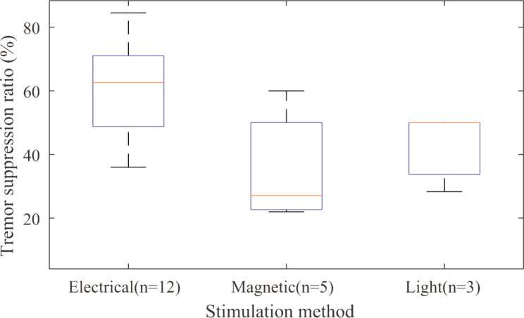 Results and conclusion: Thirty-one studies were found for qualitative analysis, and 16 studies were found for quantitative synthesis. Based on the suppression ratio, methods can be ordered as electrical stimulation, light therapy, and magnetic stimulation. Furthermore, the results showed that electrical and magnetic stimulation were more effective for tremor suppression at early stages of PD, while light therapy was found to be more effective during the later stages of PD.