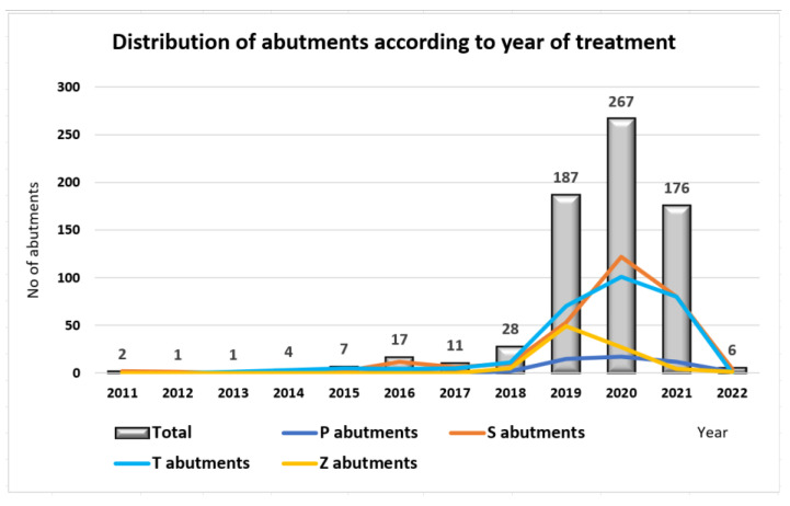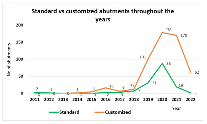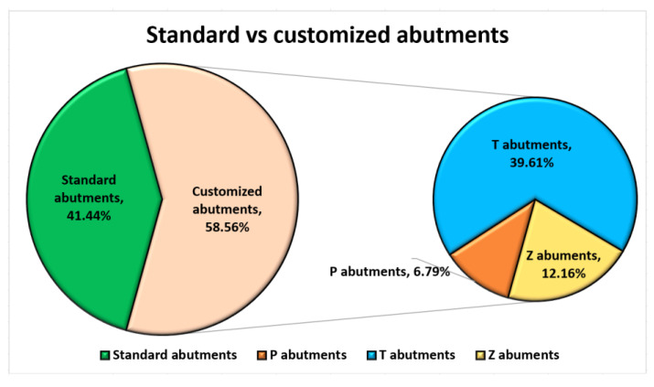 Personalized medicine has become an important direction to offer better solutions for health problems. In implantology, this trend was materialized through customizing dental abutments to each clinical situation. The demands for better esthetics and function of implant-supported restorations have imposed a more personalized variety of prosthetic abutments. This retrospective study compared clinical efficiency of personalized implant abutments with standard implant abutments in multiple implant restorations. Clinical data of patients who were admitted in a private clinic between 2011 and 2022 and received dental implant treatments were collected. All complications and undesired events from the patients' medical record charts were statistically analyzed. The implants were loaded using either standard or customized abutments. For complete arch rehabilitations with the SKY Fast & Fixed protocol, standard titanium prosthetic abutments were used. Our results suggest that the abutments choice for patients has moved throughout the years more towards the use of customized abutments. The number of customized abutments (414) was higher compared with the number of standard abutments (293). In our database, the most used abutments for the anterior area implants were made of titanium and zirconia, whereas for the posterior area, the preferred abutments were mostly titanium. The standard abutments were used almost entirely for immediate loading and implantation in both anterior and posterior areas (Fast & Fixed protocol). Complications were encountered mainly in restorations with standard abutments (9.22%) compared to customized abutments (2.7%), with titanium abutments being the most reliable, having only 1.79% complications.