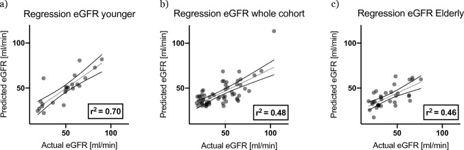 Results: In the biopsy registry, n = 774 patients were identified, of whom 268 were ≥ 65 years old. Among them, ANCA-associated vasculitis was the most prevalent kidney disease (n = 54 ≈ 20%). After a follow-up of 2 years, overall mortality was 13.4%, with 19% and 4% in patients ≥ and < 65 years of age, respectively. While 41% of elderly and 25% of younger patients were dialysis-dependent at the time of biopsy, renal recovery was achieved in 41% and 57% of patients, respectively. The accuracy of prediction differed significantly between the whole cohort and elderly patients as regard to mortality (sensitivity 46% vs. 90%, respectively) and between younger and elderly patients as regard to eGFR (r2 = 0.7 vs. 0.46, respectively). Age-group-wise analysis revealed patients above 80 years of age to have particularly dismal renal outcome and survival.