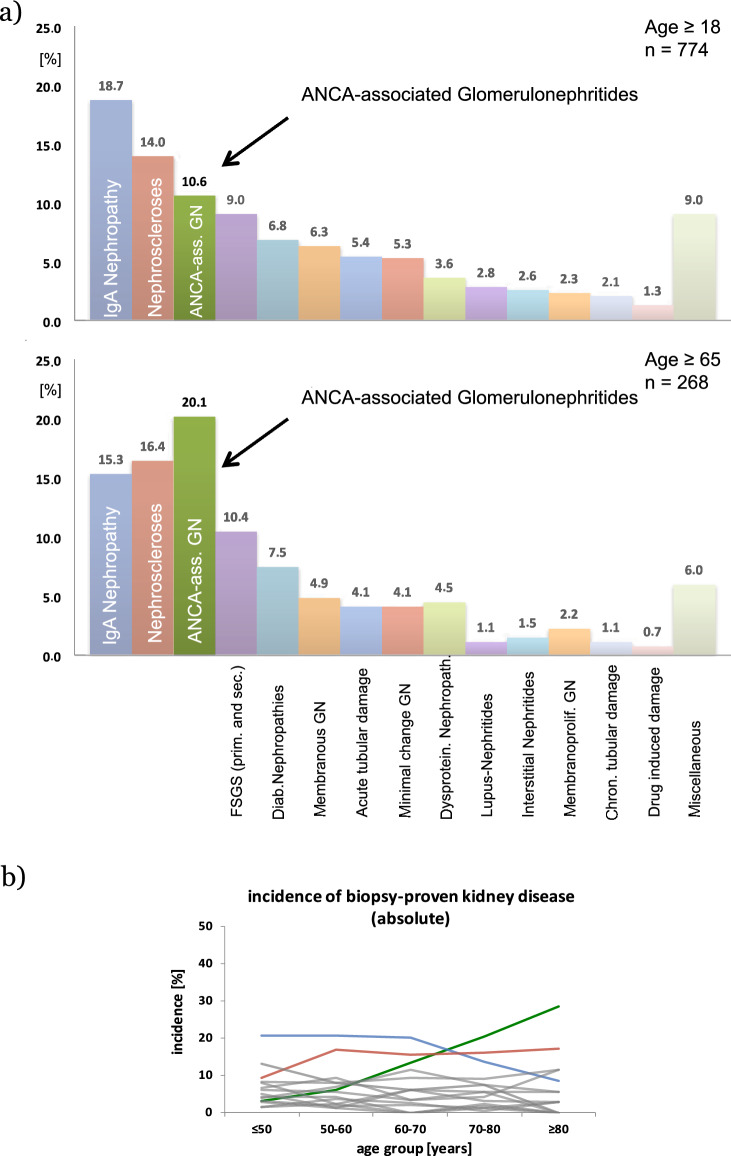 Conclusion: In our cohort, ANCA-associated vasculitis is the single most frequent histopathological diagnosis among the elderly patients in our cohort. Elderly and younger patients have comparable chances of recovering from dialysis-dependent renal failure, with comparable residual independent kidney function after two years. This study suggests (1) relevant predictors differ between age groups and hence (2) models involving all patients with ANCA-associated vasculitis neglect important features of vulnerable subgroups, i.e., patients above 80 years old.