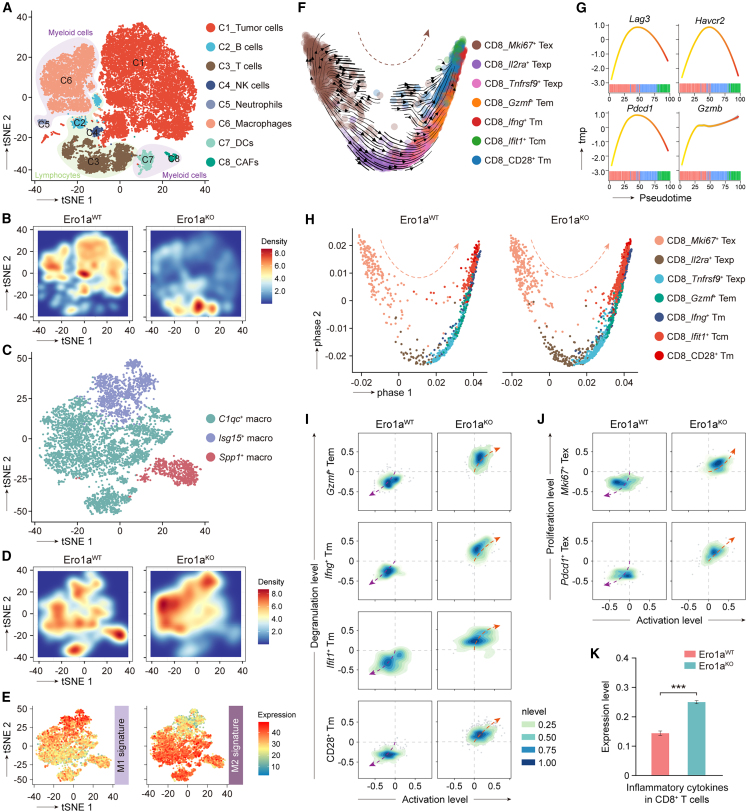 Immunophenotyping of the tumor microenvironment (TME) is essential for enhancing immunotherapy efficacy. However, strategies for characterizing the TME exhibit significant heterogeneity. Here, we show that endoplasmic reticular oxidoreductase-1α (ERO1A) mediates an immune-suppressive TME and attenuates the response to PD-1 blockade. Ablation of ERO1A in tumor cells substantially incites anti-tumor T cell immunity and promotes the efficacy of aPD-1 in therapeutic models. Single-cell RNA-sequencing analyses confirm that ERO1A correlates with immunosuppression and dysfunction of CD8+ T cells along anti-PD-1 treatment. In human lung cancer, high ERO1A expression is associated with a higher risk of recurrence following neoadjuvant immunotherapy. Mechanistically, ERO1A ablation impairs the balance between IRE1α and PERK signaling activities and induces lethal unfolded protein responses in tumor cells undergoing endoplasmic reticulum stress, thereby enhancing anti-tumor immunity via immunogenic cell death. These findings reveal how tumor ERO1A induces immunosuppression, highlighting its potential as a therapeutic target for cancer immunotherapy.