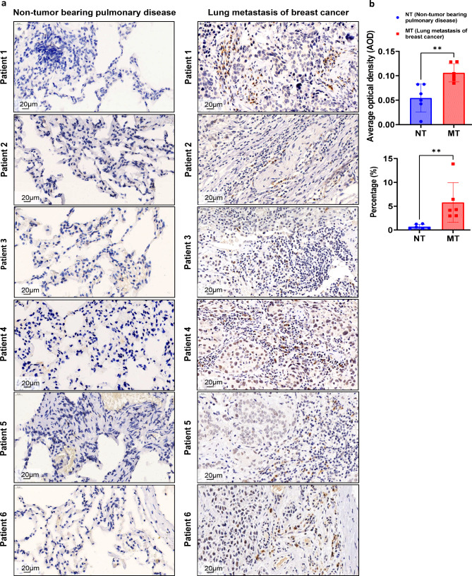 Results: Breast cancer-bearing mice suffered chronic stress metastasized earlier and showed more severe lung metastasis than did mice in control group. VAChT, ChAT and ChAT+ epithelial cells were increased significantly in lung of model mice undergone chronic stress. ACh and chemokines especially CXCL2 in lung culture supernatants from model mice with chronic stress were profoundly increased. Chronic stress remodeled lung immune cell subsets with striking increase of neutrophils, enhanced NETosis in lung and promoted NETotic neutrophils to capture cancer cells. ACh treatment resulted in enhanced NETosis of neutrophils. The expression of ChAT in lung tissues from breast cancer patients with lung metastasis was significantly higher than that in patients with non-tumor pulmonary diseases.