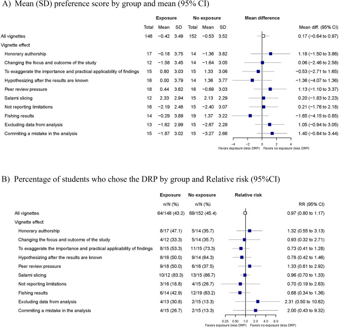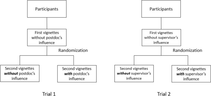 Our aim was to describe the research practices of doctoral students facing a dilemma to research integrity and to assess the impact of inappropriate research environments, i.e. exposure to (a) a post-doctoral researcher who committed a Detrimental Research Practice (DRP) in a similar situation and (b) a supervisor who did not oppose the DRP. We conducted two 2-arm, parallel-group randomized controlled trials. We created 10 vignettes describing a realistic dilemma with two alternative courses of action (good practice versus DRP). 630 PhD students were randomized through an online system to a vignette (a) with (n = 151) or without (n = 164) exposure to a post-doctoral researcher; (b) with (n = 155) or without (n = 160) exposure to a supervisor. The primary outcome was a score from - 5 to + 5, where positive scores indicated the choice of DRP and negative scores indicated good practice. Overall, 37% of unexposed participants chose to commit DRP with important variation across vignettes (minimum 10%; maximum 66%). The mean difference [95%CI] was 0.17 [- 0.65 to 0.99;], p = 0.65 when exposed to the post-doctoral researcher, and 0.79 [- 0.38; 1.94], p = 0.16, when exposed to the supervisor. In conclusion, we did not find evidence of an impact of postdoctoral researchers and supervisors on student research practices.Trial registration: NCT04263805, NCT04263506 (registration date 11 February 2020).