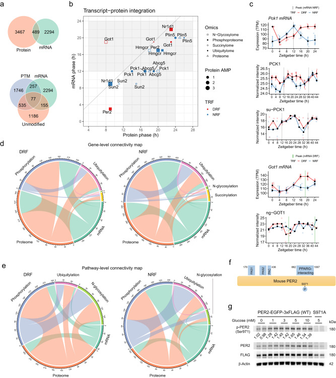 Post-translational modifications (PTMs) couple feed-fast cycles to diurnal rhythms. However, it remains largely uncharacterized whether and how meal timing organizes diurnal rhythms beyond the transcriptome. Here, we systematically profile the daily rhythms of the proteome, four PTMs (phosphorylation, ubiquitylation, succinylation and N-glycosylation) and the lipidome in the liver from young female mice subjected to either day/sleep time-restricted feeding (DRF) or night/wake time-restricted feeding (NRF). We detect robust daily rhythms among different layers of omics with phosphorylation the most nutrient-responsive and succinylation the least. Integrative analyses reveal that clock regulation of fatty acid metabolism represents a key diurnal feature that is reset by meal timing, as indicated by the rhythmic phosphorylation of the circadian repressor PERIOD2 at Ser971 (PER2-pSer971). We confirm that PER2-pSer971 is activated by nutrient availability in vivo. Together, this dataset represents a comprehensive resource detailing the proteomic and lipidomic responses by the liver to alterations in meal timing.