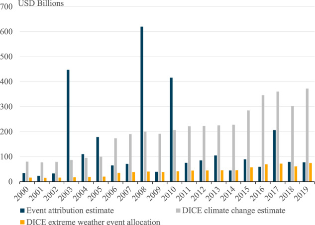 Extreme weather events lead to significant adverse societal costs. Extreme Event Attribution (EEA), a methodology that examines how anthropogenic greenhouse gas emissions had changed the occurrence of specific extreme weather events, allows us to quantify the climate change-induced component of these costs. We collect data from all available EEA studies, combine these with data on the socio-economic costs of these events and extrapolate for missing data to arrive at an estimate of the global costs of extreme weather attributable to climate change in the last twenty years. We find that US[Formula: see text] 143 billion per year of the costs of extreme events is attributable to climatic change. The majority (63%), of this is due to human loss of life. Our results suggest that the frequently cited estimates of the economic costs of climate change arrived at by using Integrated Assessment Models may be substantially underestimated.