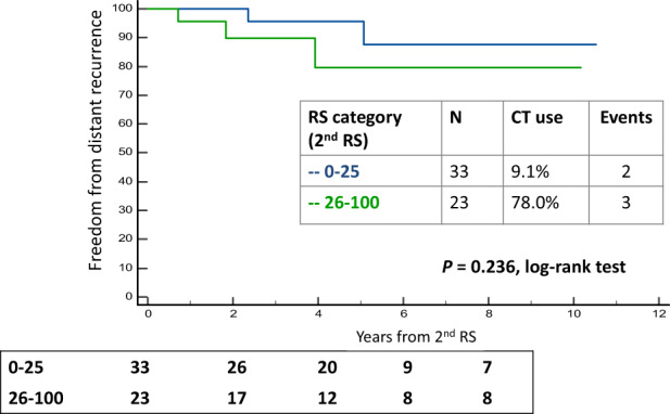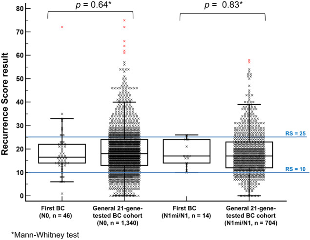 Data on using the 21-gene Recurrence Score (RS) testing on second breast cancer (BC; second primary or local recurrence) are lacking. This cohort study examined patients with first and second BC, who underwent 21-gene testing both times. It included a 'study-cohort' (60 N0/N1mi/N1 ER + HER2‒ BC patients with ≥2 RS results >1 year apart) and a 'general 21-gene-tested BC-cohort' (2044 previously described N0/N1mi/N1 patients). The median time between the first and second BC was 5.2 (IQR, 3.1-7.1) years; the second BC was ipsilateral in 68%. Patient/tumor characteristics of the first- and second-BC in the 'study-cohort' were similar, except for the RS which was higher in the second BC (median [IQR]: 23 [17-30] vs 17 [14-22], p < 0.001). Overall, 56 patients had follow-up data, of whom 5 experienced distant recurrence (2 RS 11-25 patients and 3 RS 26-100 patients). Studies exploring the prognostic utility of the RS in this setting are warranted.