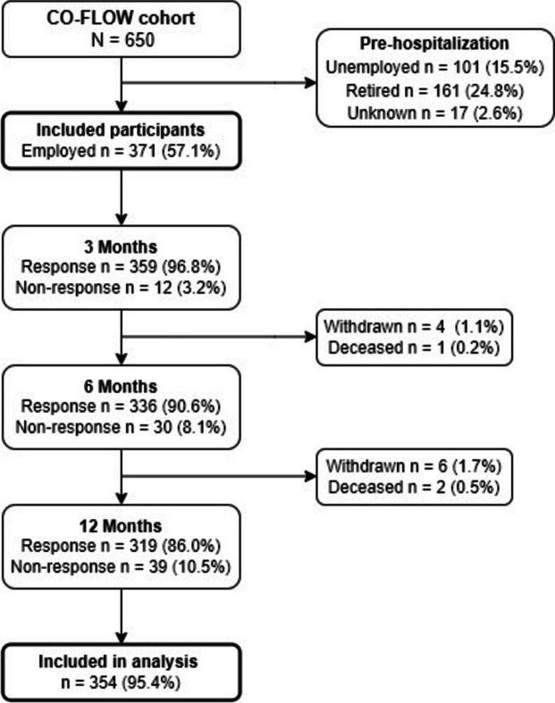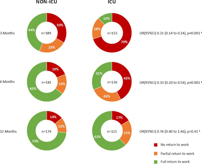 Results: In the CO-FLOW study, 371 participants were employed pre-hospitalization. At 3, 6, and 12 months post-discharge, 50% (170/342), 29% (92/317), and 15% (44/295) of participants had not returned to work, and 21% (71/342), 21% (65/317), and 16% (48/295) only partially, respectively. ICU admission (adjusted odds ratio (95% confidence interval): 0.17 (0.10 to 0.30), p < 0.001), persistent fatigue (0.93 (0.90 to 0.97), p < 0.001), female sex (0.57 (0.36 to 0.90), p = 0.017), and older age (0.96 (0.93 to 0.98), p < 0.001) were independently associated with no return to work. ICU patients required a longer time to return to work than non-ICU patients. Patients who did not return or partially returned to work reported lower scores on all domains of HRQoL than those who fully returned.