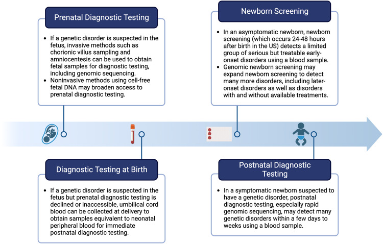 During the neonatal period, many genetic disorders present and contribute to neonatal morbidity and mortality. Genomic medicine-the use of genomic information in clinical care- has the potential to significantly reduce morbidity and mortality in the neonatal period and improve outcomes for this population. Diagnostic genomic testing for symptomatic newborns, especially rapid testing, has been shown to be feasible and have diagnostic and clinical utility, particularly in the short-term. Ongoing studies are assessing the feasibility and utility, including personal utility, of implementation in diverse populations. Genomic screening for asymptomatic newborns has also been studied, and the acceptability and feasibility of such an approach remains an active area of investigation. Emerging precision therapies, with examples even at the "n-of-1" level, highlight the promise of precision diagnostics to lead to early intervention and improve outcomes. To sustainably implement genomic medicine in neonatal care in an ethical, effective, and equitable manner, we need to ensure access to genetics and genomics knowledge, access to genomic tests, which is currently limited by payors, feasible processes for ordering these tests, and access to follow up in the clinical and research realms. Future studies will provide further insight into enablers and barriers to optimize implementation strategies.