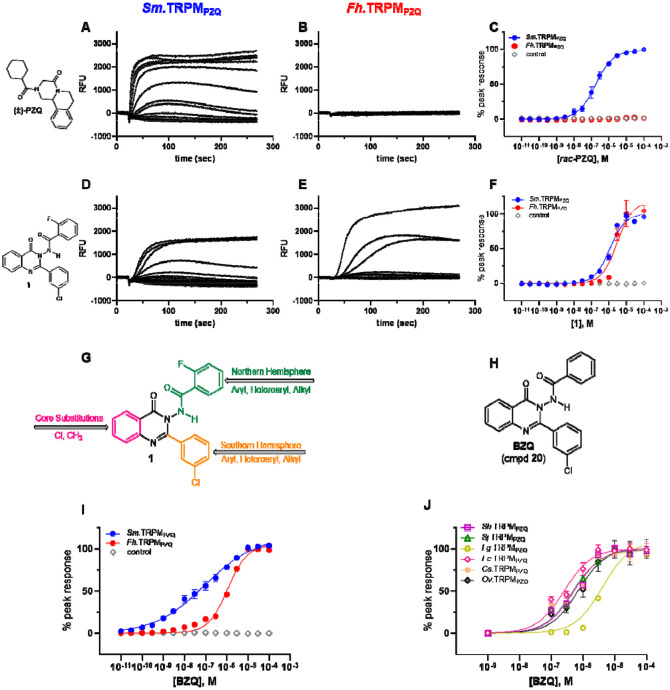 Diseases caused by parasitic flatworms impart a considerable healthcare burden worldwide. Many of these diseases - for example, the parasitic blood fluke infection, schistosomiasis - are treated with the drug praziquantel (PZQ). However, PZQ is ineffective against disease caused by liver flukes from the genus Fasciola. This is due to a single amino acid change within the target of PZQ, a transient receptor potential ion channel (TRPMPZQ), in Fasciola species. Here we identify benzamidoquinazolinone analogs that are active against Fasciola TRPMPZQ. Structure-activity studies define an optimized ligand (BZQ) that caused protracted paralysis and damage to the protective tegument of these liver flukes. BZQ also retained activity against Schistosoma mansoni comparable to PZQ and was active against TRPMPZQ orthologs in all profiled species of parasitic fluke. This broad spectrum activity was manifest as BZQ adopts a pose within the binding pocket of TRPMPZQ dependent on a ubiquitously conserved residue. BZQ therefore acts as a universal activator of trematode TRPMPZQ and a first-in-class, broad spectrum flukicide.