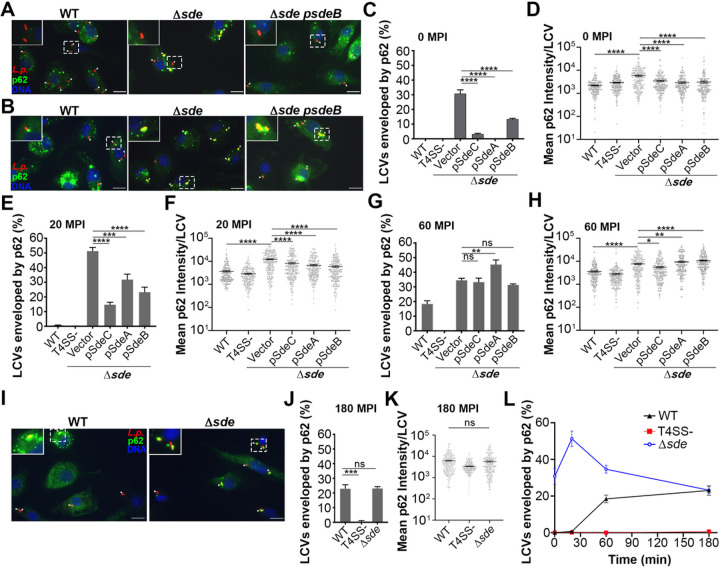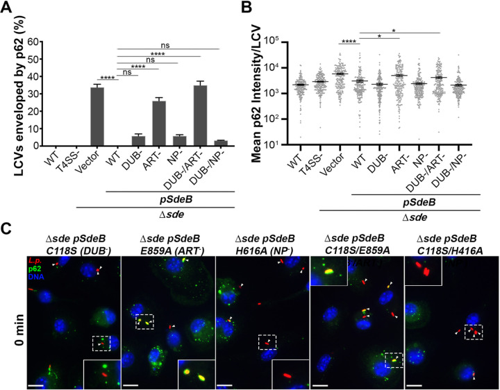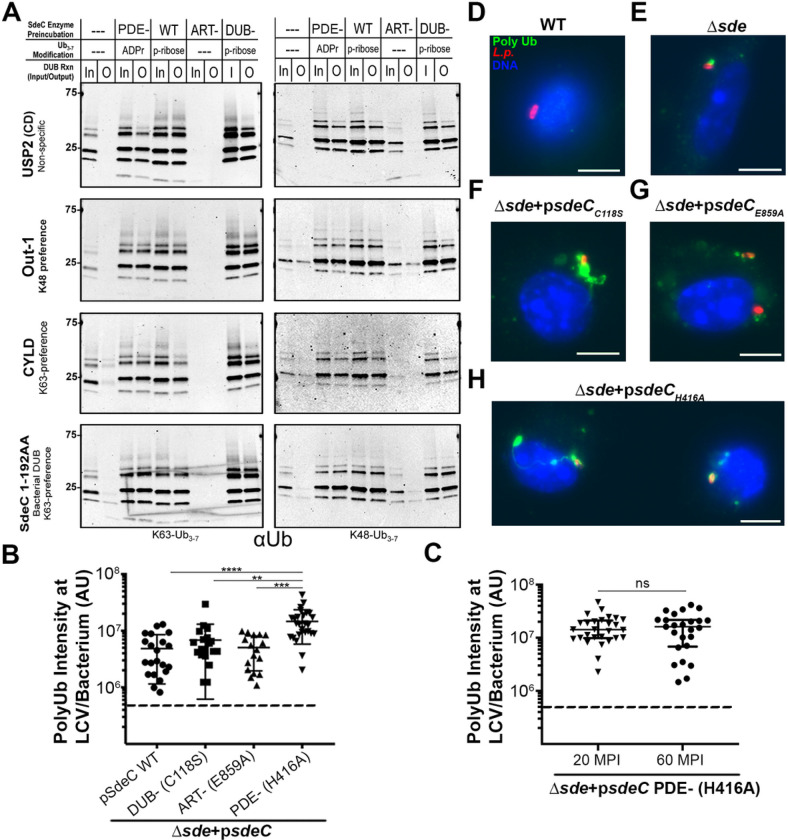 The Legionella pneumophilaSde family of translocated proteins promote host tubular endoplasmic reticulum (ER) rearrangements that are tightly linked to phosphoribosyl-ubiquitin (pR-Ub) modification of Reticulon 4 (Rtn4). Sde proteins have two additional activities of unclear relevance to the infection process: K63 linkage-specific deubiquitination and phosphoribosyl modification of polyubiquitin (pR-Ub). We show here that the deubiquitination activity (DUB) stimulates ER rearrangements while pR-Ub protects the replication vacuole from cytosolic surveillance by autophagy. Loss of DUB activity was tightly linked to lowered pR-Ub modification of Rtn4, consistent with the DUB activity fueling the production of pR-Ub-Rtn4. In parallel, phosphoribosyl modification of polyUb, in a region of the protein known as the isoleucine patch, caused an absolute block in binding by the autophagy adapter p62. An inability of Sde mutants to modify polyUb resulted in immediate p62 association, a critical precursor to autophagic attack. The ability of Sde WT to block p62 association decayed quickly after bacterial infection, as predicted by the presence of previously characterized L. pneumophila effectors that inactivate Sde and remove polyUb. In sum, these results show that the accessory Sde activities act to stimulate ER rearrangements and protect from host innate immune sensing in a temporal fashion.