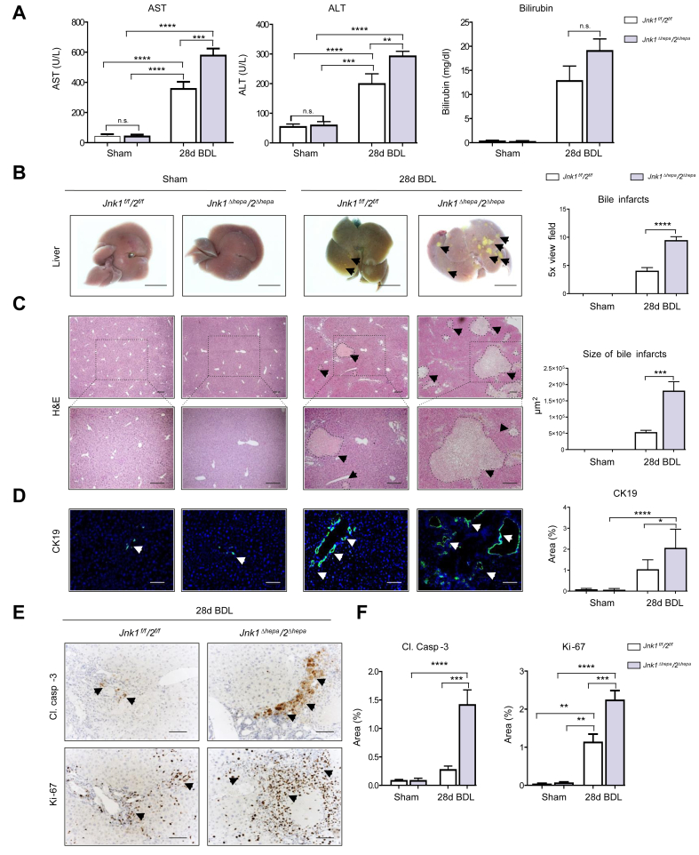 Background & aims: Cholestatic liver injury is associated with c-Jun N-terminal kinases (JNK) activation in distinct cell types. Its hepatocyte-specific function during cholestasis, however, has not yet been established. Therefore, in our present study, we investigated the role of JNK1/2 during cholestasis and dissected its hepatocyte-specific function.