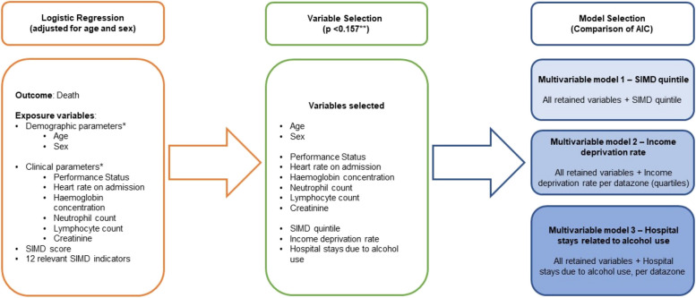 Results: After adjusting for age and sex, we found an increased risk of mortality in the more deprived SIMD quintiles 1 and 3 (OR 1.75, CI 0.99-3.08, p = 0.053 and OR 2.17, CI 1.22-3.86, p = 0.009, respectively), but this association was not upheld in our multivariable model containing age, sex, Performance Status and clinical parameters of severity at admission. Of the 12 pre-selected indicators of deprivation, two were associated with greater mortality in our multivariable analysis: income deprivation rate categorised by quartile (Q4 (most deprived): 2.11 (1.20-3.77) p = 0.011)) and greater than expected hospitalisations due to alcohol per SIMD data zone (1.96 (1.28-3.00) p = 0.002)).