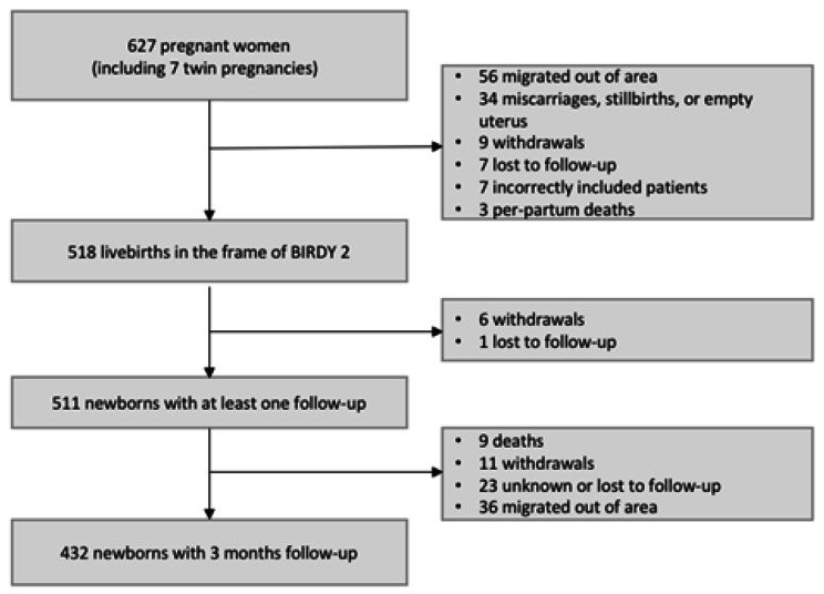 Methods: The BIRDY 2 study was a prospective community-based mother and child cohort, both in urban and semi-rural areas. All pregnant women in the study areas were identified and enrolled. Their newborns were actively and passively followed-up from birth to 3 months. Data on clinical symptoms developed by the children and laboratory results of all clinical samples investigated were collected. A Cox proportional hazards model was performed to identify risk factors associated with possible severe bacterial infection.