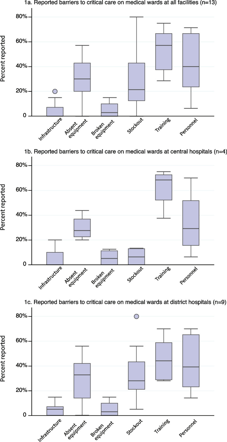 Results: From the 13 hospitals, we analysed data from 39 medical ward staff members through staffing, infrastructure, equipment, and systems domains. No medical wards met the WFSICCM definition of level 1 ICU. The most common barriers in district hospital medical wards compared to central hospital wards were stock-outs (29%, Cl: 21% to 44% vs 6%, Cl: 0% to 13%) and personnel shortages (40%, Cl: 24% to 67% vs 29%, Cl: 16% to 52%) but central hospital wards reported a higher proportion of training barriers (68%, Cl: 52% to 73% vs 45%, Cl: 29% to 60%). No differences were statistically significant.