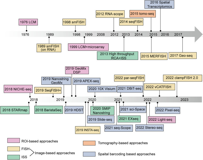The proper functioning of diverse biological systems depends on the spatial organization of their cells, a critical factor for biological processes like shaping intricate tissue functions and precisely determining cell fate. Nonetheless, conventional bulk or single-cell RNA sequencing methods were incapable of simultaneously capturing both gene expression profiles and the spatial locations of cells. Hence, a multitude of spatially resolved technologies have emerged, offering a novel dimension for investigating regional gene expression, spatial domains, and interactions between cells. Spatial transcriptomics (ST) is a method that maps gene expression in tissue while preserving spatial information. It can reveal cellular heterogeneity, spatial organization and functional interactions in complex biological systems. ST can also complement and integrate with other omics methods to provide a more comprehensive and holistic view of biological systems at multiple levels of resolution. Since the advent of ST, new methods offering higher throughput and resolution have become available, holding significant potential to expedite fresh insights into comprehending biological complexity. Consequently, a rapid increase in associated research has occurred, using these technologies to unravel the spatial complexity during developmental processes or disease conditions. In this review, we summarize the recent advancement of ST in historical, technical, and application contexts. We compare different types of ST methods based on their principles and workflows, and present the bioinformatics tools for analyzing and integrating ST data with other modalities. We also highlight the applications of ST in various domains of biomedical research, especially development and diseases. Finally, we discuss the current limitations and challenges in the field, and propose the future directions of ST.