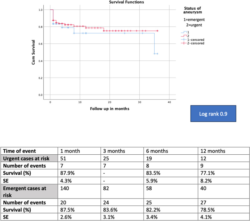 Results: 225 patients (36.5% females, 72.5 ± 2.8 years) were included; 73.0% were urgent. The mean aneurysm diameter was 109 ± 3.9 mm and 44.4% were type I-III TAAAs. Females (p = .03), para-renal aneurysms (p = .02) and ASA score IV (p < .001) were more common in emergent cases. Technical success was 97.8%. Thirty-day mortality and MAE rates were 17.8% and 30.6%, respectively. SCI rate was 14.7%, (4.8% paraplegia rate) with 22.2% of patients receiving prophylactic cerebrospinal drainage. Thirty-day mortality (13.3% vs. 26.7%, p = .04) and MAE (26.0% vs. 43.0%, p = .02) were more common among emergent cases while technical success (97.6% vs. 98.3%, p = .9), and SCI (13.3% vs. 18.3%, p = .4) were similar. Survival at 12-months was 83.5% (SE 5.9%) for the urgent and 77.1% (SE 8.2%) for the emergent group (log rank, p = 0.96).