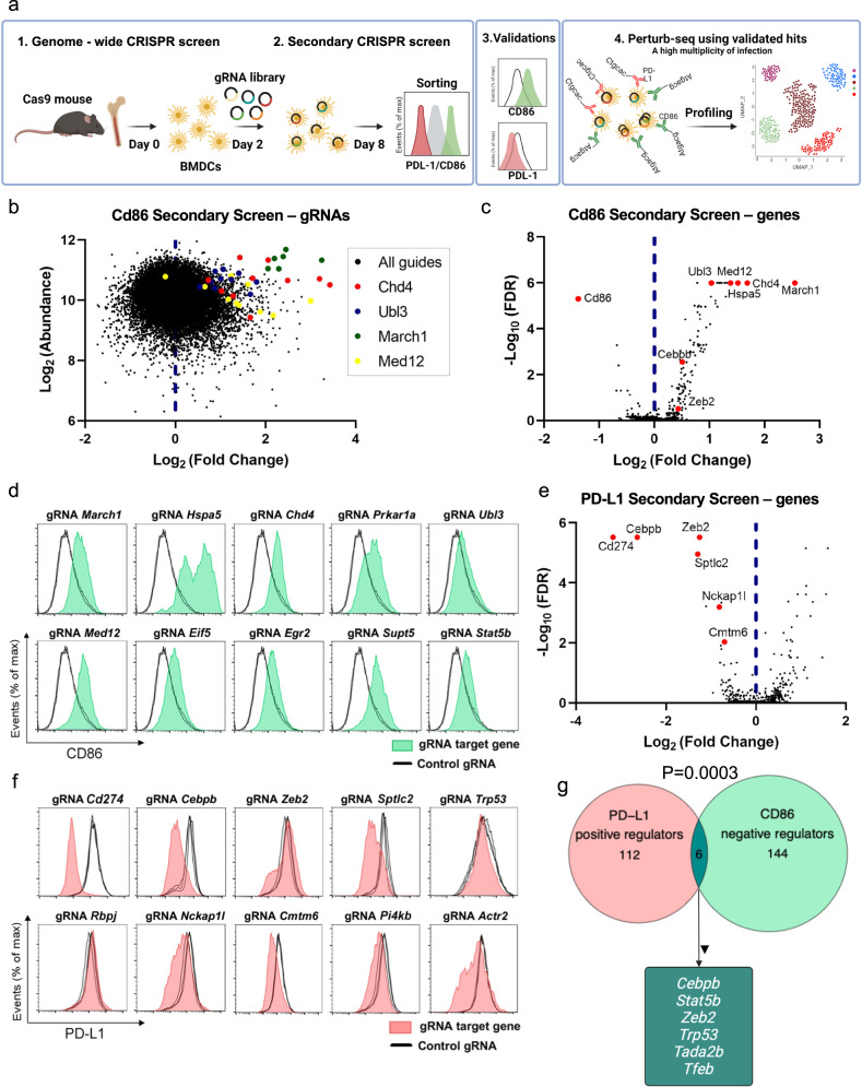 Genetic engineering of immune cells has opened new avenues for improving their functionality but it remains a challenge to pinpoint which genes or combination of genes are the most beneficial to target. Here, we conduct High Multiplicity of Perturbations and Cellular Indexing of Transcriptomes and Epitopes (HMPCITE-seq) to find combinations of genes whose joint targeting improves antigen-presenting cell activity and enhances their ability to activate T cells. Specifically, we perform two genome-wide CRISPR screens in bone marrow dendritic cells and identify negative regulators of CD86, that participate in the co-stimulation programs, including Chd4, Stat5b, Egr2, Med12, and positive regulators of PD-L1, that participate in the co-inhibitory programs, including Sptlc2, Nckap1l, and Pi4kb. To identify the genetic interactions between top-ranked genes and find superior combinations to target, we perform high-order Perturb-Seq experiments and we show that targeting both Cebpb and Med12 results in a better phenotype compared to the single perturbations or other combinations of perturbations.
