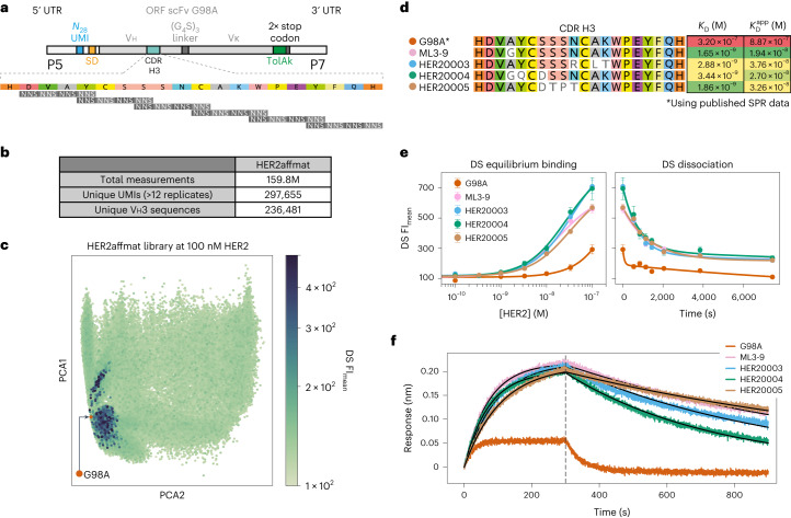 Developing therapeutic antibodies is laborious and costly. Here we report a method for antibody discovery that leverages the Illumina HiSeq platform to, within 3 days, screen in the order of 108 antibody-antigen interactions. The method, which we named 'deep screening', involves the clustering and sequencing of antibody libraries, the conversion of the DNA clusters into complementary RNA clusters covalently linked to the instrument's flow-cell surface on the same location, the in situ translation of the clusters into antibodies tethered via ribosome display, and their screening via fluorescently labelled antigens. By using deep screening, we discovered low-nanomolar nanobodies to a model antigen using 4 × 106 unique variants from yeast-display-enriched libraries, and high-picomolar single-chain antibody fragment leads for human interleukin-7 directly from unselected synthetic repertoires. We also leveraged deep screening of a library of 2.4 × 105 sequences of the third complementarity-determining region of the heavy chain of an anti-human epidermal growth factor receptor 2 (HER2) antibody as input for a large language model that generated new single-chain antibody fragment sequences with higher affinity for HER2 than those in the original library.