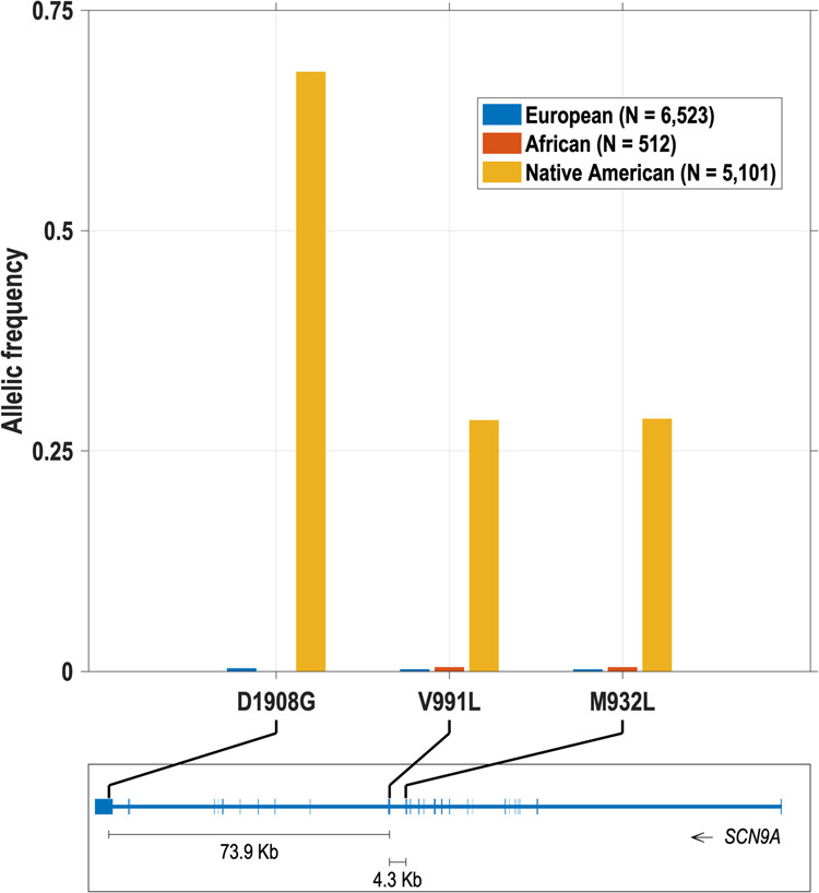 The Nav1.7 voltage-gated sodium channel plays a key role in nociception. Three functional variants in the SCN9A gene (encoding M932L, V991L, and D1908G in Nav1.7), have recently been identified as stemming from Neanderthal introgression and to associate with pain symptomatology in UK BioBank data. In 1000 genomes data, these variants are absent in Europeans but common in Latin Americans. Analysing high-density genotype data from 7594 Latin Americans, we characterized Neanderthal introgression in SCN9A. We find that tracts of introgression occur on a Native American genomic background, have an average length of ~123 kb and overlap the M932L, V991L, and D1908G coding positions. Furthermore, we measured experimentally six pain thresholds in 1623 healthy Colombians. We found that Neanderthal ancestry in SCN9A is significantly associated with a lower mechanical pain threshold after sensitization with mustard oil and evidence of additivity of effects across Nav1.7 variants. Our findings support the reported association of Neanderthal Nav1.7 variants with clinical pain, define a specific sensory modality affected by archaic introgression in SCN9A and are consistent with independent effects of the Neanderthal variants on Nav1.7 function.