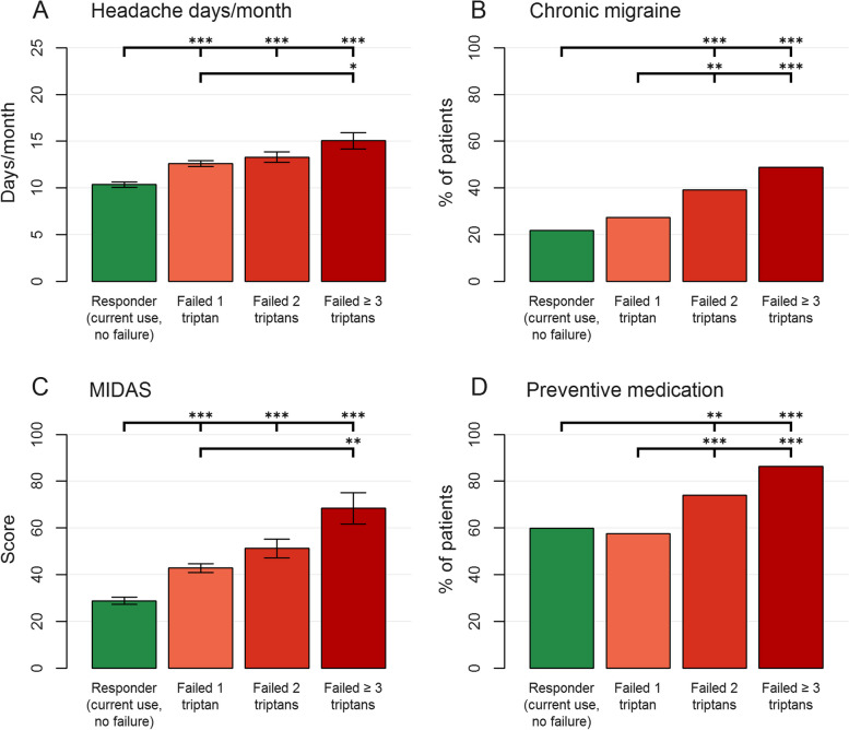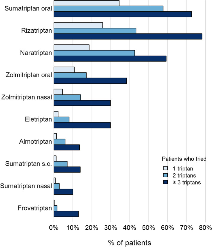 Results: A total of 2284 adult migraine patients (females: 85.4%, age: 39.4 ± 12.8 years) were included. 42.5% (n = 970) had failed ≥ 1 triptan, 13.1% (n = 300) had failed ≥ 2 triptans (meeting the EHF definition of 'triptan resistance'), and 3.9% (n = 88) had failed ≥ 3 triptans. Compared to triptan responders (current use, no failure, n = 597), triptan non-responders had significantly more severe migraine (higher frequency (p < 0.001), intensity (p < 0.05), and disability (p < 0.001)), that further increased with the level of triptan failure. Responders rates were highest for nasal and oral zolmitriptan, oral eletriptan and subcutaneous sumatriptan.