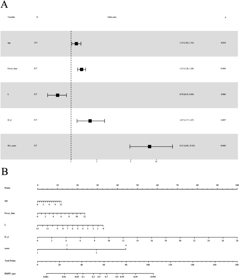 Conclusion: This study proposes a predictive nomogram only based on five variables. The nomogram can be used for early identification of RMPP among pediatric patients with MPP, thereby facilitating more timely and effective intervention.
