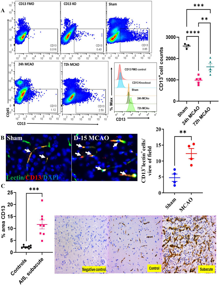 Results: Brain CD13 expression and infiltrated CD13+ monocytes and neutrophils increased acutely after the stroke. The brain CD13+lectin+ blood vessels increased on day 15 after the stroke. Similarly, an increase in the percentage area CD13 was observed in human stroke patients at the subacute time after stroke. Deletion of CD13 resulted in reduced infarct volume and improved neurological recovery after acute stroke. However, CD13KO mice had significantly worse memory deficits, amplified gliosis, and white matter damage compared to wild-type animals at chronic time points. CD13-deficient mice had an increased percentage of CXCL12+cells but a reduced percentage of CXCR4+cells and decreased angiogenesis at day 30 post-stroke.