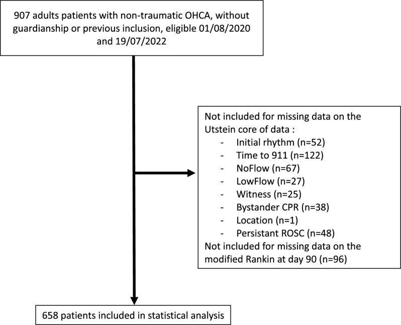 Results: During the study period, 907 patients were screened, and 658 were included in the study. Patients were predominantly male (72%), with a mean age of 61 ± 15, most having collapsed from a supposed cardiac cause (64%). The mortality rate at day 90 was 63% and unfavorable neurological outcomes were observed in 66%. The performance (AUROC) of Utstein criteria for poor outcome prediction was moderate at 0.79 [0.76-0.83], whereas AUROCs from other scores varied from 0.79 [0.75-0.83] to 0.88 [0.86-0.91]. For each score, the proportion of patients for whom individual values could not be calculated varied from 1.4% to 17.4%.