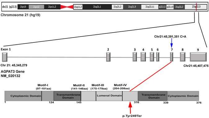 Intellectual disability (ID) and retinal dystrophy (RD) are the frequently found features of multiple syndromes involving additional systemic manifestations. Here, we studied a family with four members presenting severe ID and retinitis pigmentosa (RP). Using genome wide genotyping and exome sequencing, we identified a nonsense variant c.747 C > A (p.Tyr249Ter) in exon 7 of AGPAT3 which co-segregates with the disease phenotype. Western blot analysis of overexpressed WT and mutant AGPAT3 in HEK293T cells showed the absence of AGPAT3, suggesting instability of the truncated protein. Knockdown of Agpat3 in the embryonic mouse brain caused marked deficits in neuronal migration, strongly suggesting that reduced expression of AGPAT3 affects neuronal function. Altogether, our data indicates that AGPAT3 activity is essential for neuronal functioning and loss of its activity probably causes intellectual disability and retinitis pigmentosa (IDRP) syndrome.