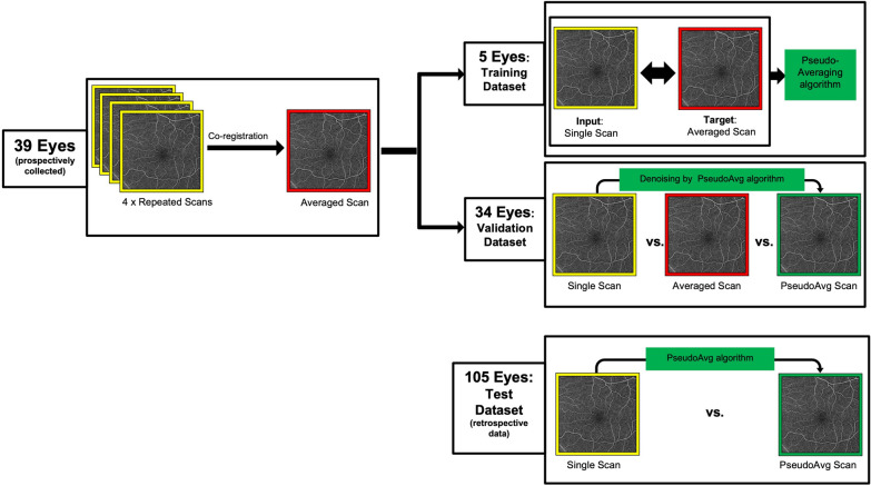 Results: This study included 39 eyes that comprised the prospective dataset (split into 5 eyes for training and 34 eyes for validating the DL algorithm), and 105 eyes that comprised the retrospective test dataset. Of the total 144 study eyes, 58% had any level of diabetic retinopathy (with and without diabetic macular edema), and the rest were from healthy eyes or eyes of diabetic subjects but without diabetic retinopathy and without macular edema. Grading results in the validation dataset showed that the pseudoaveraged enface scan ranked best in overall scan quality, background noise reduction, and visibility of microaneurysms (p < 0.05). Averaged scan ranked best for motion artifact reduction (p < 0.05). Grading results in the test dataset showed that pseudoaveraging resulted in enhanced small vessels, reduction of background noise, and motion artifact in 100%, 82%, and 98% of scans, respectively. Rates of false-positive/-negative perfusion were zero.