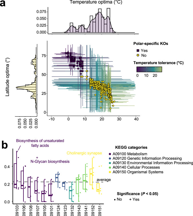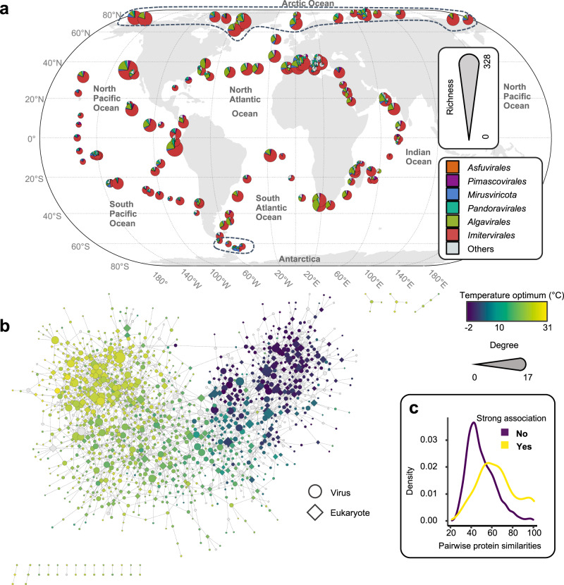 Despite being perennially frigid, polar oceans form an ecosystem hosting high and unique biodiversity. Various organisms show different adaptive strategies in this habitat, but how viruses adapt to this environment is largely unknown. Viruses of phyla Nucleocytoviricota and Mirusviricota are groups of eukaryote-infecting large and giant DNA viruses with genomes encoding a variety of functions. Here, by leveraging the Global Ocean Eukaryotic Viral database, we investigate the biogeography and functional repertoire of these viruses at a global scale. We first confirm the existence of an ecological barrier that clearly separates polar and nonpolar viral communities, and then demonstrate that temperature drives dramatic changes in the virus-host network at the polar-nonpolar boundary. Ancestral niche reconstruction suggests that adaptation of these viruses to polar conditions has occurred repeatedly over the course of evolution, with polar-adapted viruses in the modern ocean being scattered across their phylogeny. Numerous viral genes are specifically associated with polar adaptation, although most of their homologues are not identified as polar-adaptive genes in eukaryotes. These results suggest that giant viruses adapt to cold environments by changing their functional repertoire, and this viral evolutionary strategy is distinct from the polar adaptation strategy of their hosts.