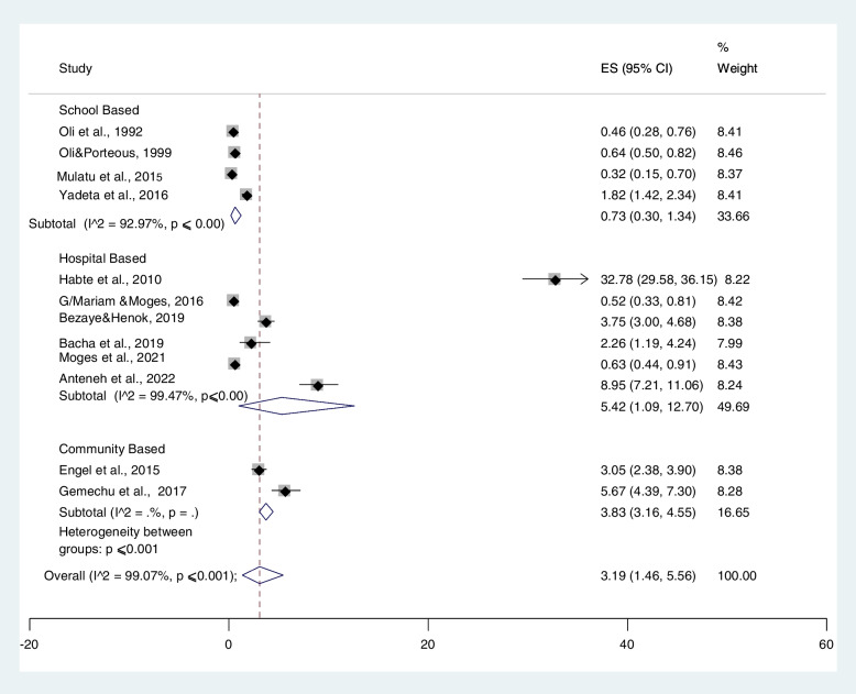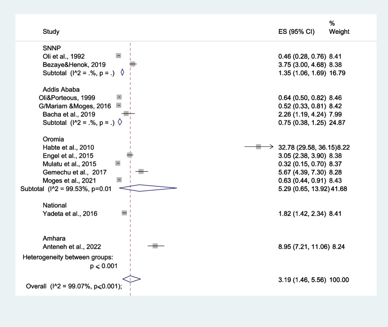 Globally, more than 33 million people are living with rheumatic heart disease (RHD). A high prevalence of the disease is observed in people with poor socio-economic status, overcrowding, and low access to medical facilities. Even though different studies have been conducted in different settings, there is no reliable data regarding RHD prevalence. Therefore, the aim of this systematic review and meta-analysis was to estimate the pooled prevalence of RHD in Ethiopia. PubMed/Medline, SCOPUS, HINARI, and Google Scholar databases were used to search for peer-reviewed articles. Articles published in English between the years 1992 and 2022 September were considered. The pooled prevalence of RHD was calculated using a random-effect model at a 95% confidence interval, including the weight of each study. Finally, statistical meta-analysis STATA version 16.0 software was used to calculate the pooled prevalence of RHD.A total of twelve cross-sectional studies were included in the meta-analysis. Individual study prevalence ranges from 0.32 to 32.78%. The pooled prevalence of RHD was 3.19% (95% CI: 1.46-5.56%). The prevalence was higher among the population who visited hospitals at 5.42% (95% CI: 1.09-12.7%) compared to schoolchildren at 0.73% (95% CI: 0.30-1.34%) and community-based studies at 3.83% (95% CI: 3.16-4.55%). Addis Ababa had the lowest prevalence of RHD (0.75% (95% CI: 0.38-1.25%), whereas the highest prevalence was observed in the Amhara region (8.95% (95% CI: 7.21-11.06%). A significant variation in the overall estimated prevalence of RHD was not observed between males and females.Trial registration Protocol registration (PROSPERO): CRD42021251553, Date of registration May 28 2021.