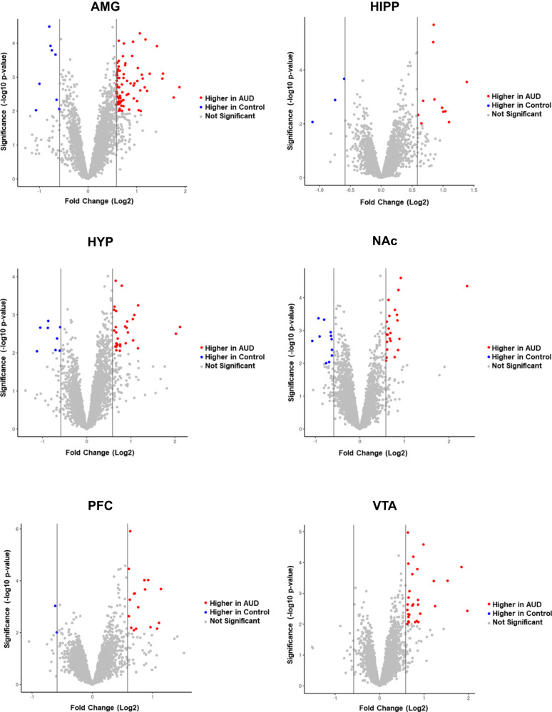 Alcohol use disorder (AUD) affects transcriptomic, epigenetic and proteomic expression in several organs, including the brain. There has not been a comprehensive analysis of altered protein abundance focusing on the multiple brain regions that undergo neuroadaptations occurring in AUD. We performed a quantitative proteomic analysis using a liquid chromatography-tandem mass spectrometry (LC-MS/MS) analysis of human postmortem tissue from brain regions that play key roles in the development and maintenance of AUD, the amygdala (AMG), hippocampus (HIPP), hypothalamus (HYP), nucleus accumbens (NAc), prefrontal cortex (PFC) and ventral tegmental area (VTA). Brain tissues were from adult males with AUD (n = 11) and matched controls (n = 16). Across the two groups, there were >6000 proteins quantified with differential protein abundance in AUD compared to controls in each of the six brain regions. The region with the greatest number of differentially expressed proteins was the AMG, followed by the HYP. Pathways associated with differentially expressed proteins between groups (fold change > 1.5 and LIMMA p < 0.01) were analyzed by Ingenuity Pathway Analysis (IPA). In the AMG, adrenergic, opioid, oxytocin, GABA receptor and cytokine pathways were among the most enriched. In the HYP, dopaminergic signaling pathways were the most enriched. Proteins with differential abundance in AUD highlight potential therapeutic targets such as oxytocin, CSNK1D (PF-670462), GABAB receptor and opioid receptors and may lead to the identification of other potential targets. These results improve our understanding of the molecular alterations of AUD across brain regions that are associated with the development and maintenance of AUD. Proteomic data from this study is publicly available at www.lmdomics.org/AUDBrainProteomeAtlas/ .